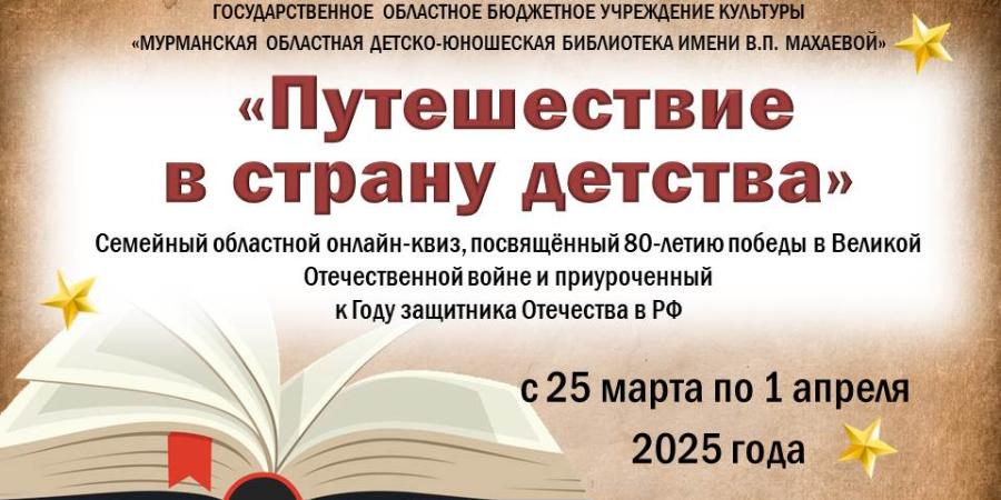 Сотрудники Медиатеки приглашают юных читателей и их родителей принять участие в семейном онлайн-квизе «Путешествие в страну детства», приуроченном к Всероссийской неделе детской книги. В этом году она проходит под девизом «История с продолжением» и посвящена сразу двум важным темам: 80-летию Победы в Великой Отечественной войне и Году защитника Отечества.