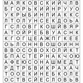 Друзья, вам необходимо отыскать фамилии русских писателей и поэтов.