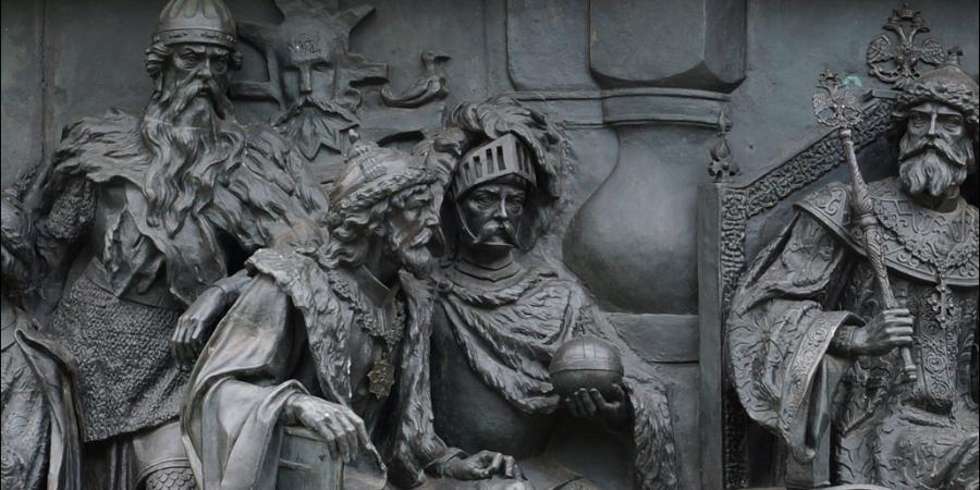 В Великом Новгороде стоит памятник, который был открыт в 1862 году в честь празднования тысячелетия истории Российского государства - Вы его видите на картинке. На этом памятнике изображены личности и фигуры, связанные с историей России. Но на памятник попали не только русские правители или знаменитые личности. Слева вы видите трех мужчин, изображенных на этом памятнике - их имена Гедимин, Ольгерд и Витовт. Они были князьями Литовского государства - северо-западного соседа Руси.