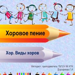 Материал урока содержит инфоормацию о значении хорового пения в развитии младших школьников и о видах хоров и их составах. Кроме того сожержит классификацию вокальных голосов.