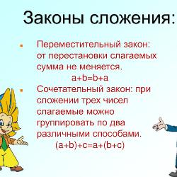 В данном уроке засмотриваются законы сложения - переместительный и сочетательный.