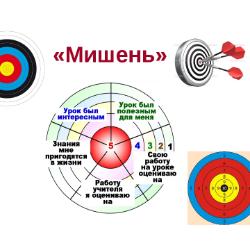 "Рефлексивная мишень" Мишень разделена на секторы. Каждый сектор — какой-то аспект урока:оценка содержания и формы урока, оценка своей деятельности, деятельности одноклассников и педагога. Секторы могут детализировать и разные стороны одного процесса, например, оценка своей деятельности на уроке может состоять из 4 секторов: «свою работу оцениваю», «было интересно», «было полезно» и «знания мне пригодятся». В конце урока каждый участник педагогического взаимодействия (т.е. и учитель тоже) делает «выстрелы» в мишень, выбирая из предложенных вариантов, вариант ответа, соответствующего его оценке того или иного аспекта по пятибальной шкале. Чем выше оценка, тем ближе к «яблочку» — центру мишени, чем ниже — тем ближе к её краю, «молоку». Мишень разделена на шесть секторов, педагог может быстро получить интересующую его информацию, после обработки опроса на компьютере. Эта техника развивает у учеников способность рефлексировать и анализировать, учит давать точную оценку разным деталям, даёт возможность высказать своё мнение и в какой-то мере повлиять на учебный процесс. Кроме указанных вопросов с выбором оценки есть вопросы с выбором ответа и вопросы, на которые надо дать ответ в свободной форме.