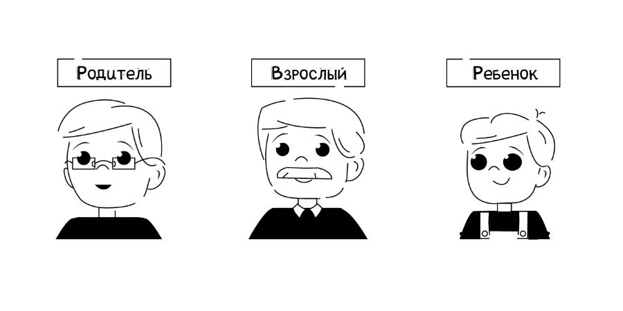 Внимательно наблюдая за людьми в подобных бытовых ситуациях, психологи сделали вывод, что основа личности человека – не единая сущность, она разбивается на три составляющих: Ребёнок, Взрослый и Родитель. Терапевты, использующие в своей практике трансакционный анализ используют аббревиатуры Д (Дитя - чтобы не спутать с Родителем), В (Взрослый) и Р (Родитель). Эти три элемента, или эго-состояния, в идеале должны работать в симбиозе и “выходить в свет” поочерёдно в зависимости от ситуации.