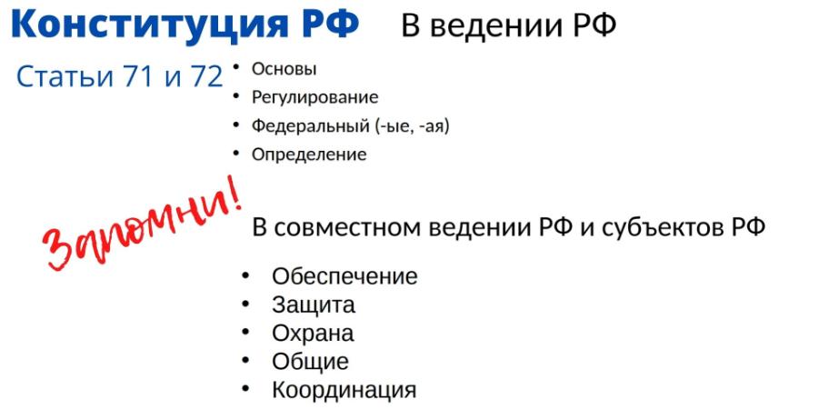 Тест направлен на запоминание статей 71 и 72 Конституции Российской Федеракции. Внимательно ознакомьтесь со статьями, затем, приступайте к тесту.