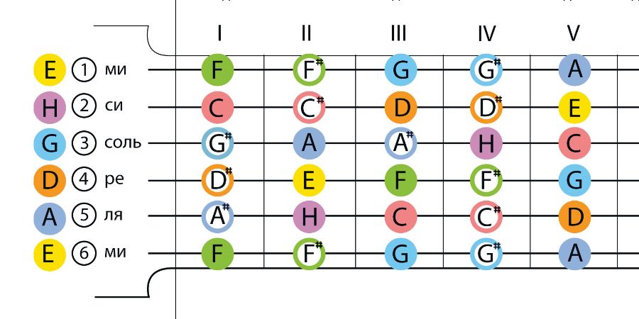 Простой тест на знание нот на грифе гитары, необходимо назвать ноту, обозначенную черной точкой