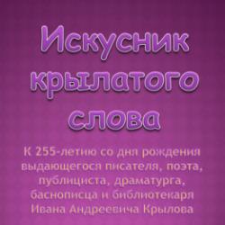 Образовательный тест по биографии и творческой деятельности И.А.Крылова, приур к 255-летию со дня рождения баснописца. Тест можно использовать на уроках литературы и при проведении внеклассных мероприятий.